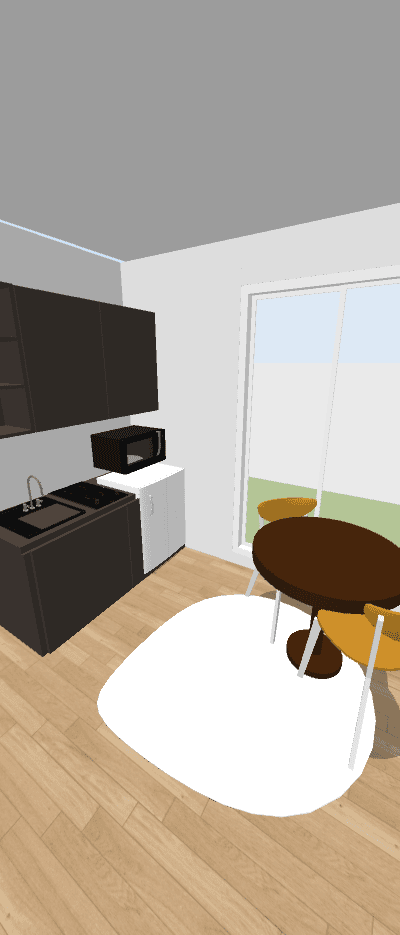 In the 20 feet container, the kitchen/living room comes with a kitchenette, a table and two chairs with a rug underneath.