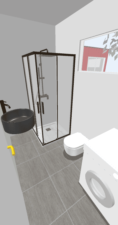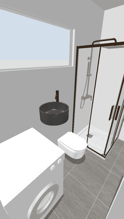 In the 20 feet container, the bathroom comes with a shower, sink, toilet and a washing machine. The window is located above the sink.