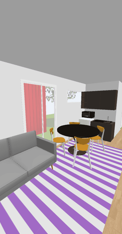 In the 40 feet container, the kitchen/living room comes with a kitchenette, a sofa, a table and two chairs with a rug underneath.